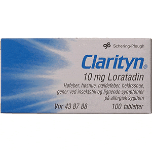 Clarityn 10 mg – antihistamin mod høfeber, nældefeber eler insektstikClarityn er et antihistamin mod allergiske symptomer. Det aktive lægemiddelstof er Loratadin. Anvendelse og virkningClarityn anvendes ved overfølsomhedsreaktioner f.eks. nældefeber og hø (Læs mere)